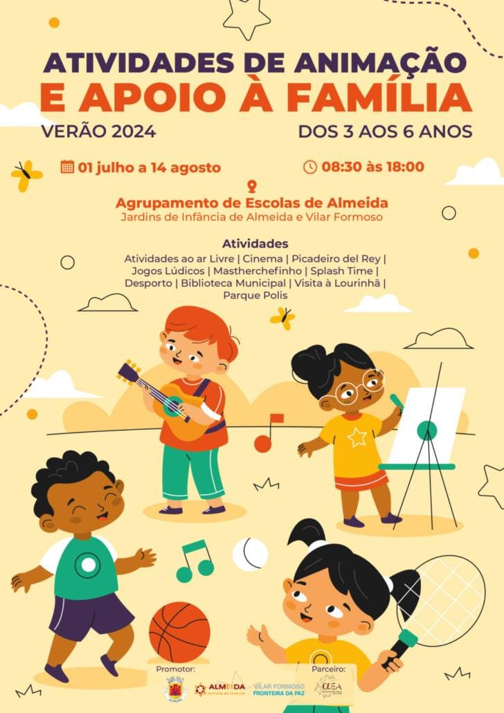 No período entre o dia 01 de julho e 14 de agosto de 2024, o Município de Almeida promove as AAAF (Atividades de Animação e Apoio à Família) nos Jardins de Infância de Almeida e Vilar Formoso.