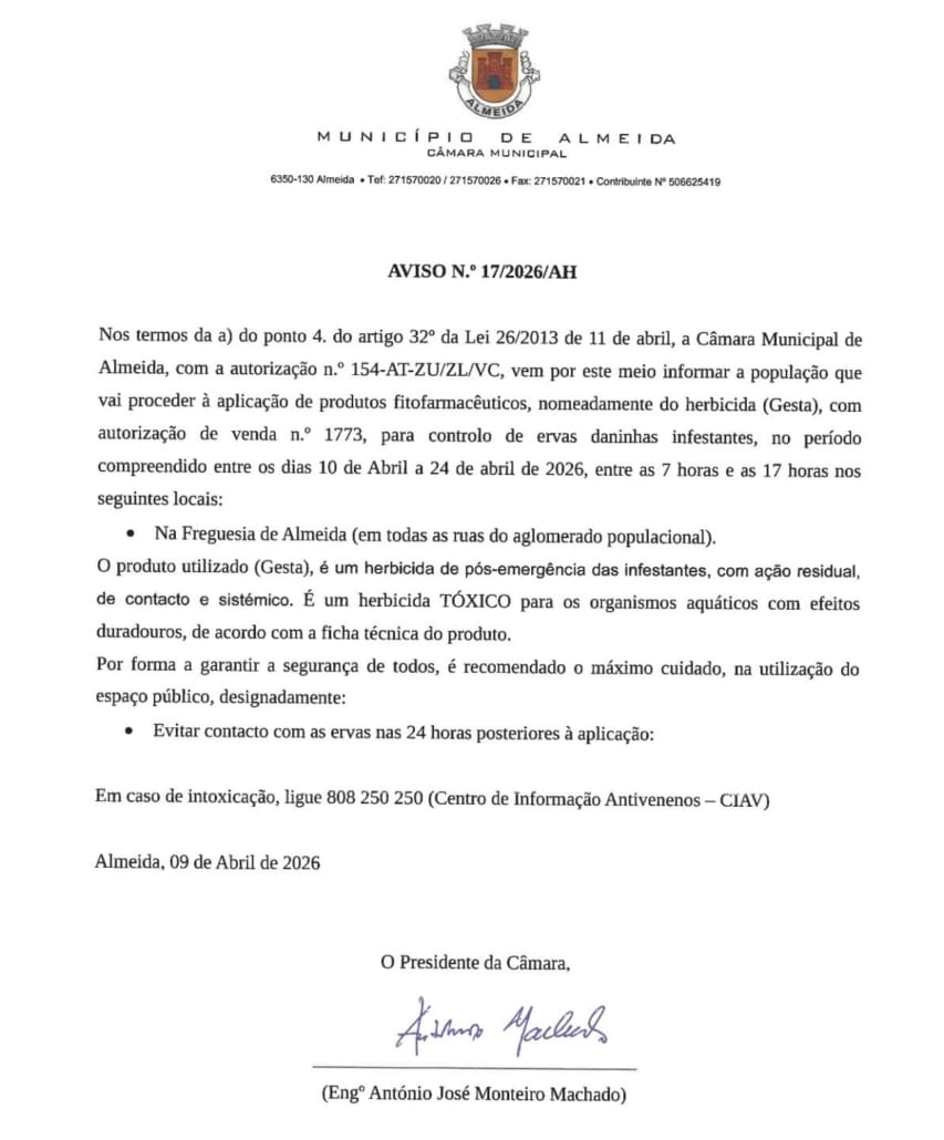AVISO Nº 17/2026/AH - Aplicação de Herbicida na Freguesia de Almeida