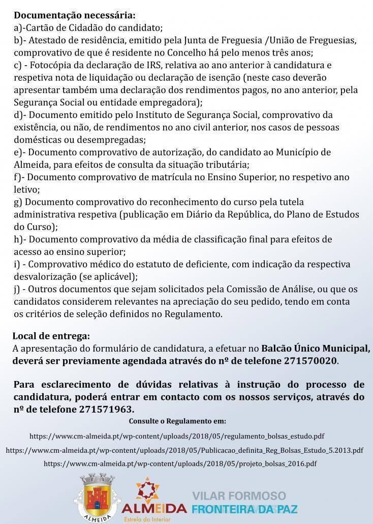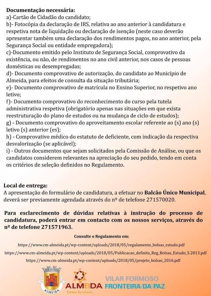 A presente medida visa a atribuição de apoios monetários a estudantes do ensino superior, residentes no Concelho de Almeida, matriculados em cursos reconhecidos pelo Ministério da Educação, mediante o cumprimentos dos requisitos do Regulamento de Atribuição de Bolsas.