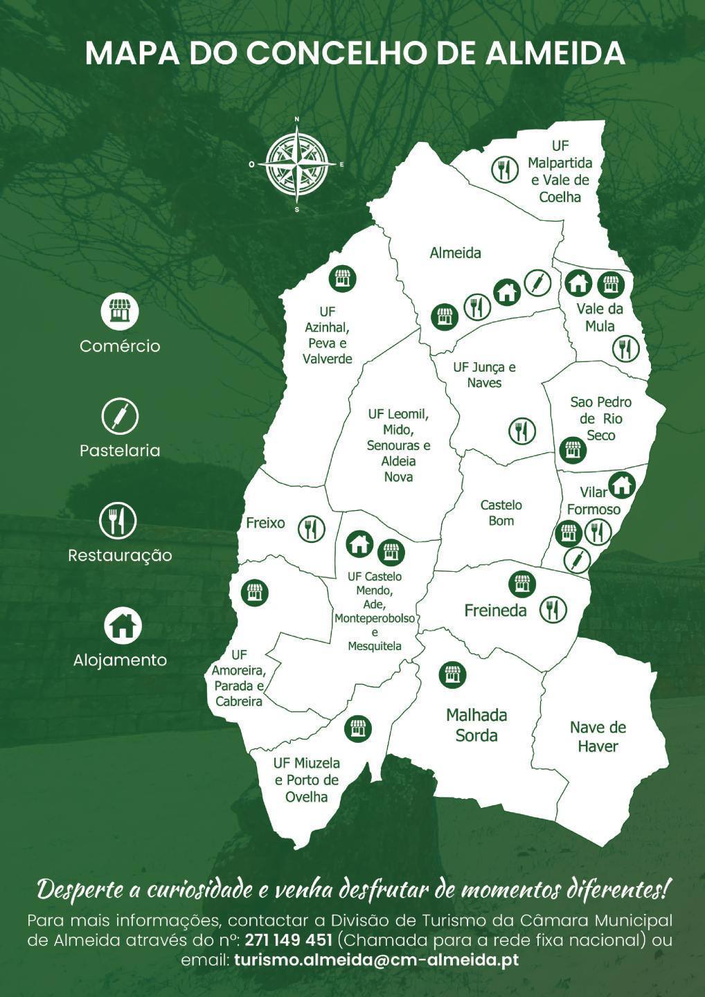 Para mais informações contatar a Divisão de Turismo: Tef: 271 149 451 (Chamada para a rede fixa nacional) | Email: turismo.almeida@cm-almeida.pt