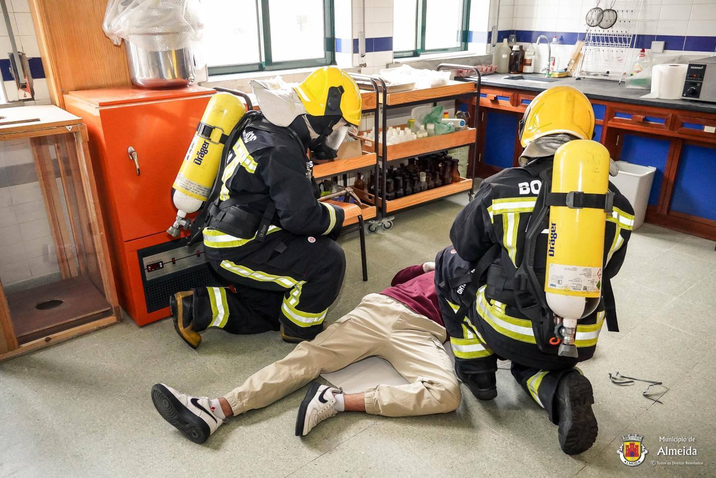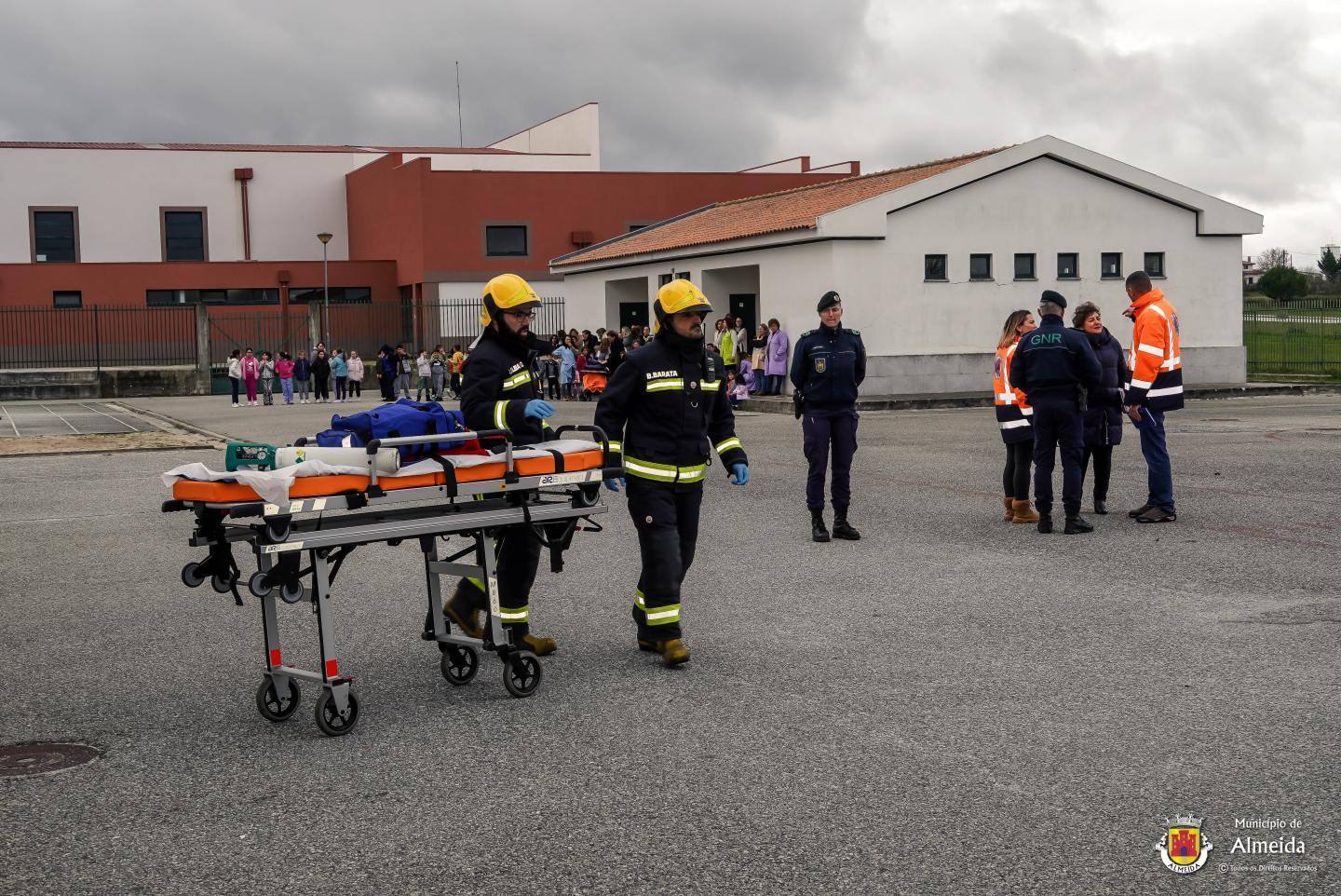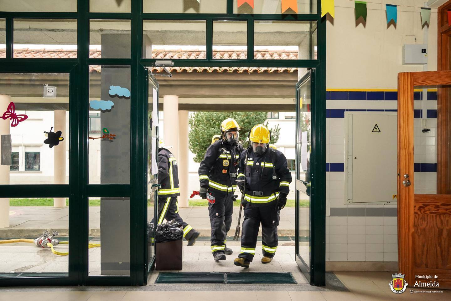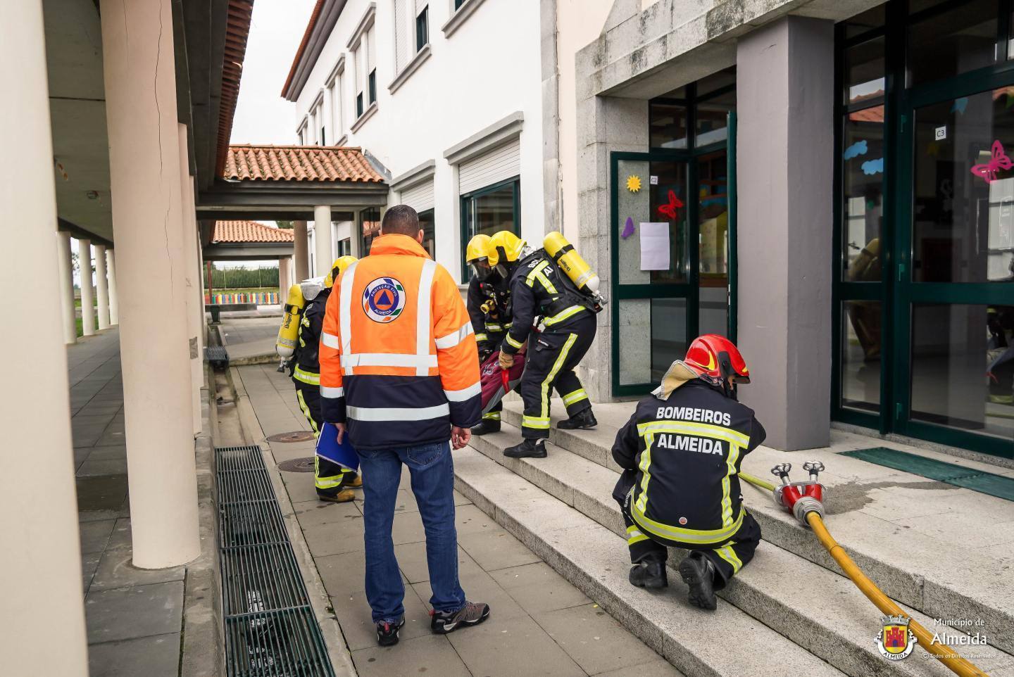 Na escola de Almeida, o toque intermitente deu o sinal de alerta para a ocorrência de um sinistro no laboratório. As salas de aula foram completamente evacuadas, com a saída ordeira dos alunos que se reuniram no ponto de encontro. À chegada das Autoridades, foi feito o reconhecimento, procedendo-se de pronto a buscas e salvamento, tendo-se verificado uma vitima, com lesões fruto de contacto com reagentes químicos.