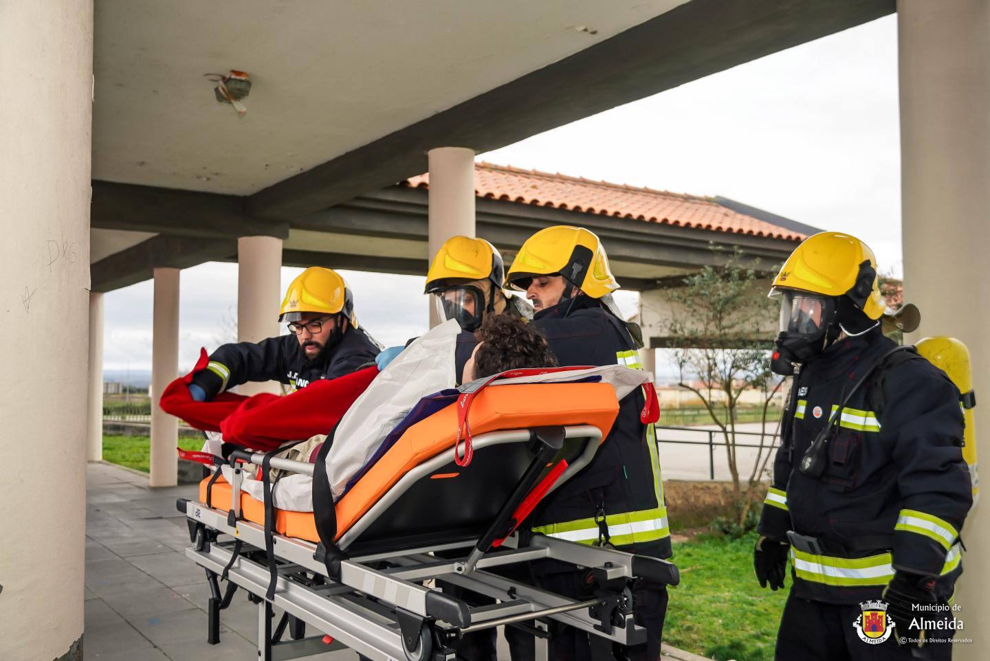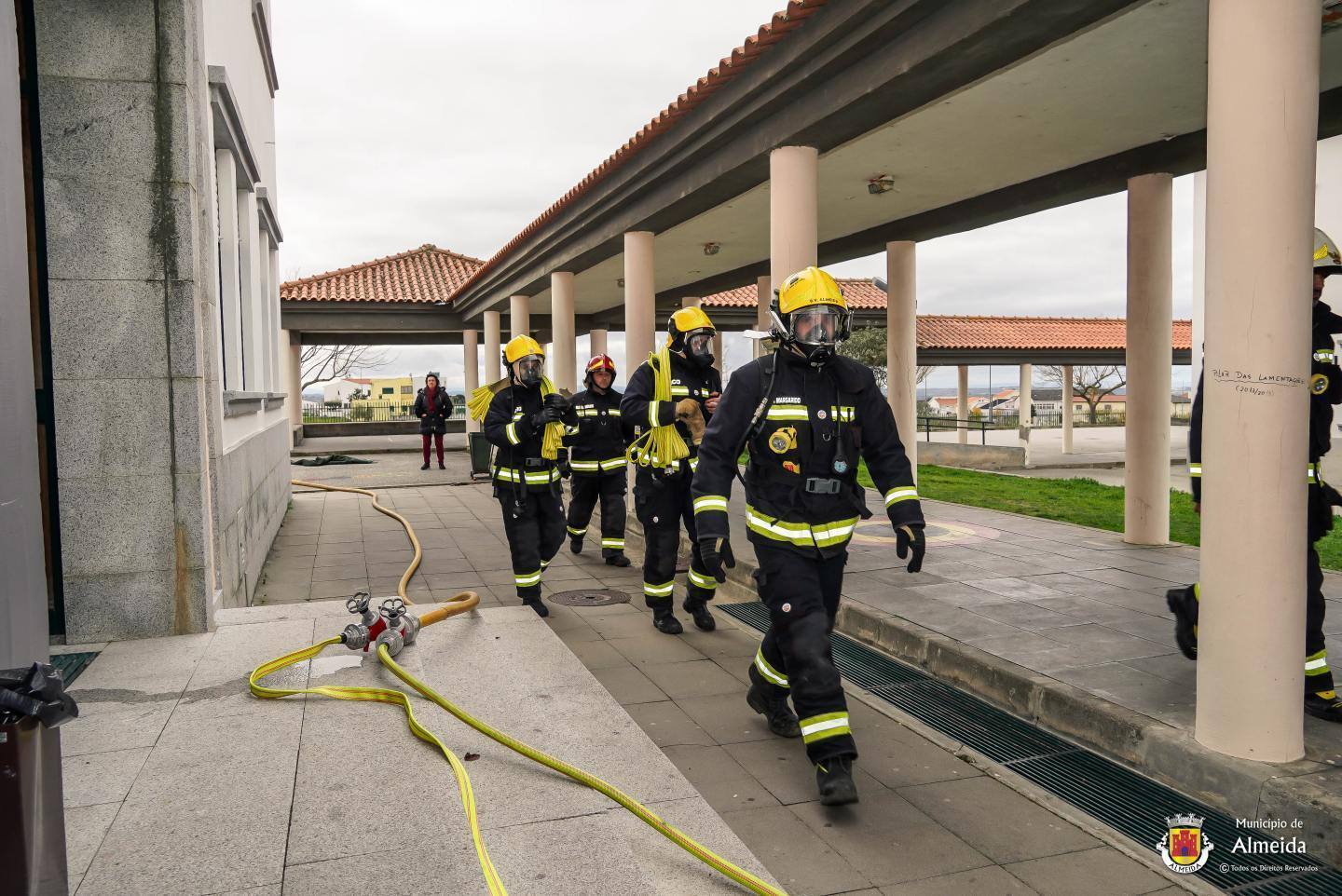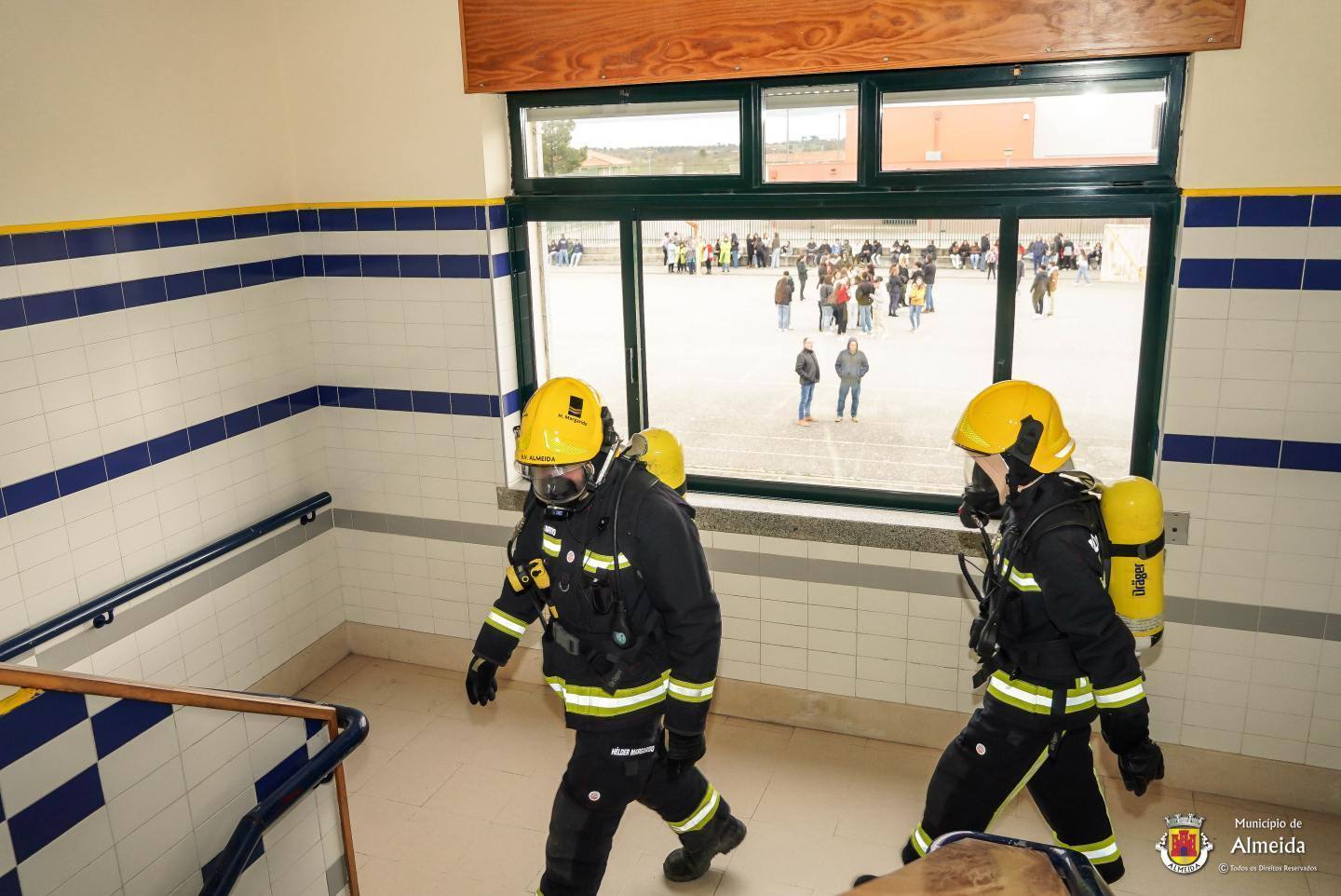 Na escola de Almeida, o toque intermitente deu o sinal de alerta para a ocorrência de um sinistro no laboratório. As salas de aula foram completamente evacuadas, com a saída ordeira dos alunos que se reuniram no ponto de encontro. À chegada das Autoridades, foi feito o reconhecimento, procedendo-se de pronto a buscas e salvamento, tendo-se verificado uma vitima, com lesões fruto de contacto com reagentes químicos.