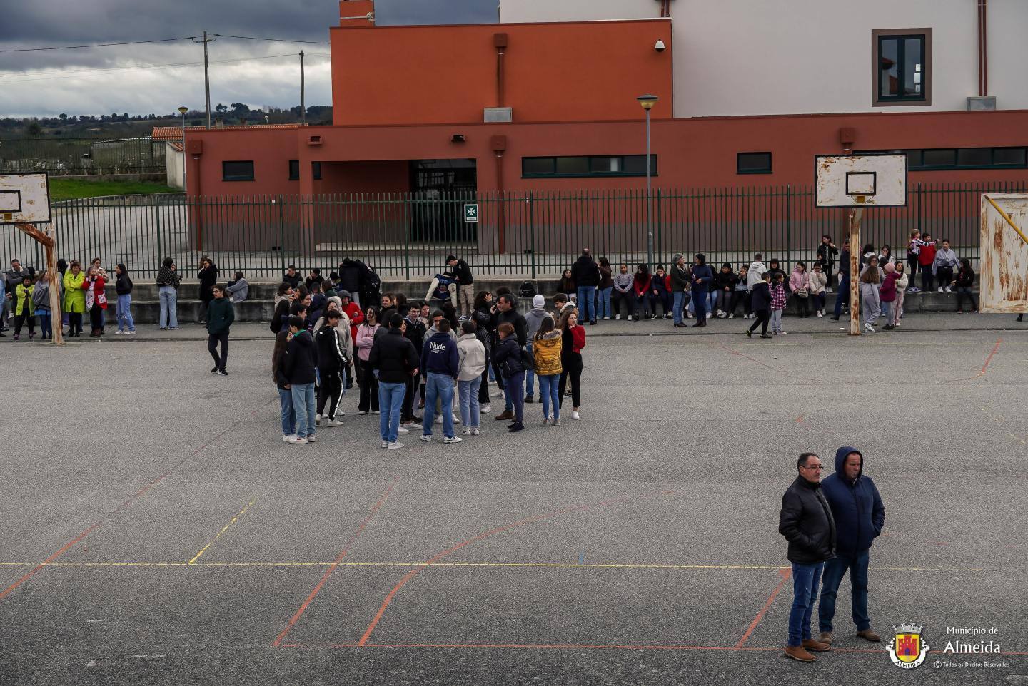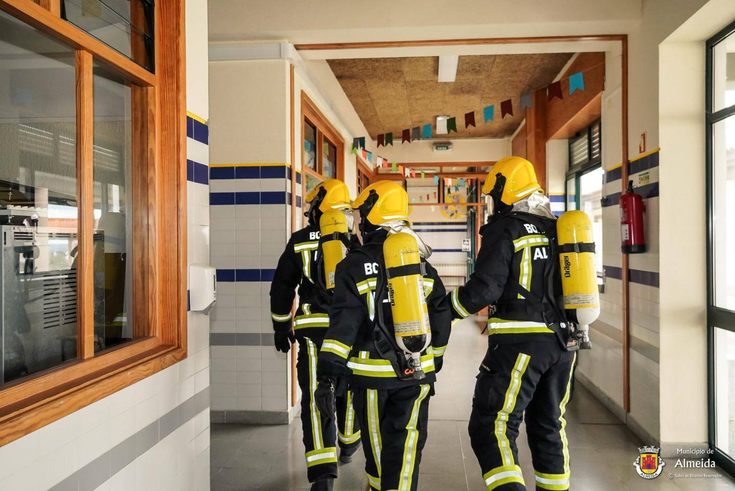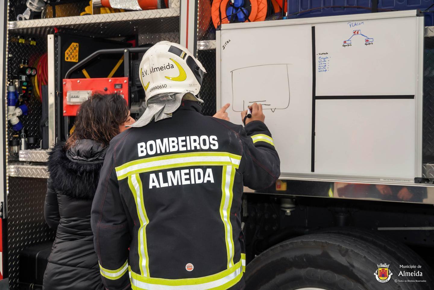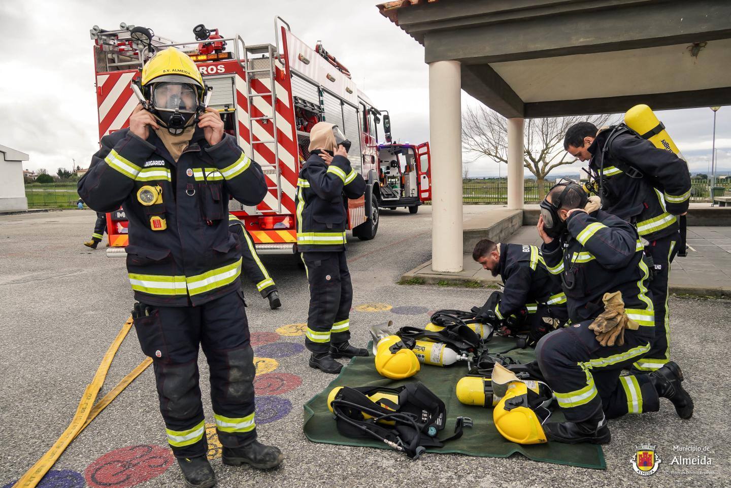 Na escola de Almeida, o toque intermitente deu o sinal de alerta para a ocorrência de um sinistro no laboratório. As salas de aula foram completamente evacuadas, com a saída ordeira dos alunos que se reuniram no ponto de encontro. À chegada das Autoridades, foi feito o reconhecimento, procedendo-se de pronto a buscas e salvamento, tendo-se verificado uma vitima, com lesões fruto de contacto com reagentes químicos.