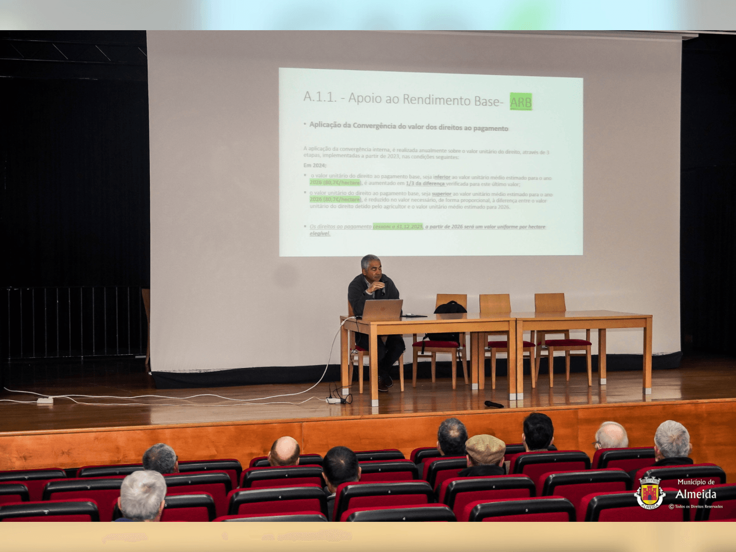 Realizou-se esta manhã, 21 de fevereiro, uma Sessão de Esclarecimento no Auditório Municipal de Almeida promovida pela CAP – Confederação dos Agricultores de Portugal, em colaboração com o Município de Almeida e a Acrialmeida – Associação de Criadores de Ruminantes Do Concelho de Almeida, onde foram apresentadas as novas regras relativamente às Ajudas do Pedido Único 2024. A sessão ficou a cargo do Eng. Rui Matos, em representação da CAP Guarda, terminando-se os trabalhos com intervenções do Presidente da Acrialmeida, Dr. José Augusto Estêvão, e do Presidente da Câmara Municipal de Almeida, Eng. António José Monteiro Machado.