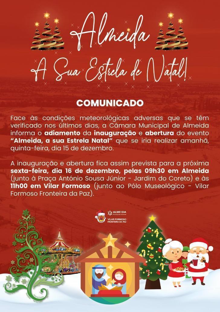 Face às condições meteorológicas adversas que se têm verificado nos últimos dias, a Câmara Municipal de Almeida informa o adiamento da inauguração e abertura do evento “Almeida, a sua Estrela Natal” que se iria realizar amanhã, quinta-feira, dia 15 de dezembro.