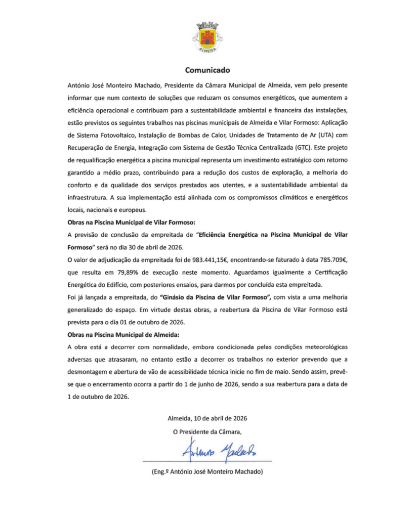 Comunicado -Encerramento e Reabertura das Piscinas Municipais