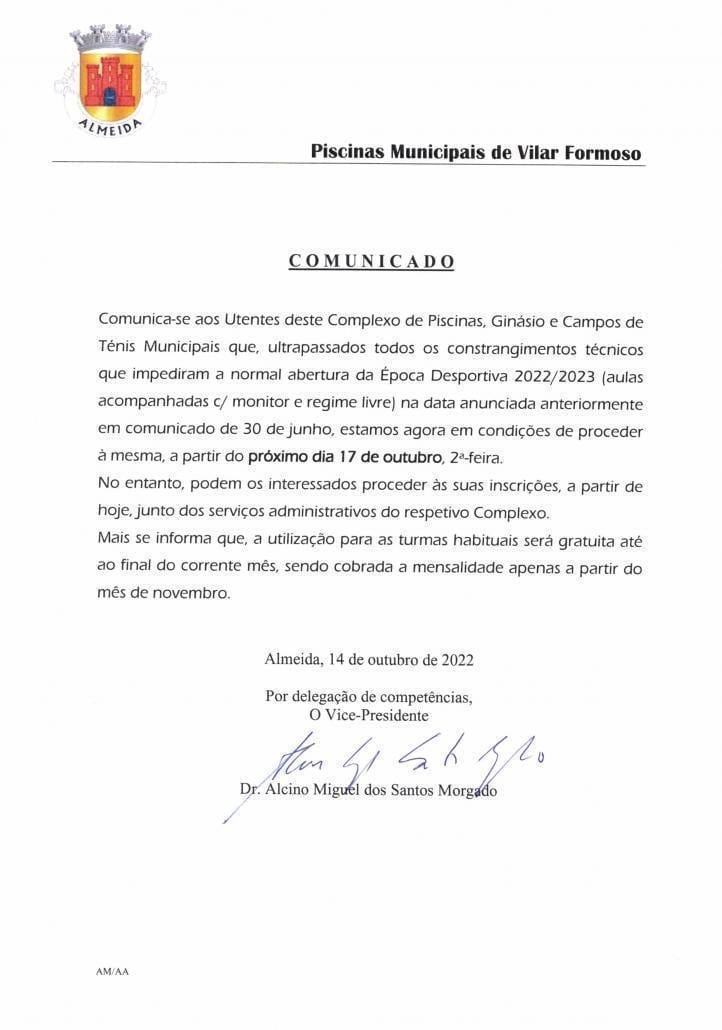 Comunicado - Piscinas Municipais de Vilar Formoso