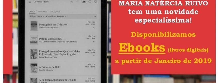Procurando estimular o acesso aos serviços e favorecer a promoção de atividades de leitura e da escrita, a partir de janeiro de 2019, a Biblioteca Municipal Maria Natércia Ruivo disponibiliza a todos os utilizadores um novo serviço: empréstimo de livros digitais (e-books) e respetivo leitores( e-readers). Num total de sessenta e sete títulos disponíveis para leitura, desde literatura portuguesa a estrangeira, infantil e juvenil, esperam por si na sua Biblioteca!