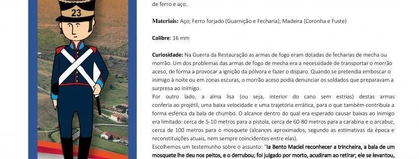 Curiosidade: Na Guerra da Restauração as armas de fogo eram dotadas de fecharias de mecha ou morrão. Um dos problemas das armas de fogo de mecha era a necessidade de transportar o morrão aceso, de forma a provocar a ignição da pólvora e fazer o disparo. Quando se pretendia emboscar o inimigo à noite ou em zonas escuras, o morrão aceso podia denunciar os soldados que preparavam a surpresa ao inimigo. Por outro lado, a alma lisa (ou seja, interior do cano sem estrias) destas armas conferia ao projétil, uma baixa velocidade e uma trajetória errática, para o que também contribuía a forma esférica da bala de chumbo. O alcance dentro do qual era esperado causar baixas ao inimigo era limitado: cerca de 5-10 metros para a pistola, cerca de 60-80 metros para a carabina e o arcabuz, cerca de 100 metros para o mosquete (alcances aproximados, segundo as estimativas da época e reconstituições atuais, nem sempre coincidentes entre elas). Escolhemos um testemunho sobre o assunto: “Ia Bento Maciel reconhecer a trincheira, a bala de um mosquete lhe deu nos peitos, e o derrubou; foi julgado por morto, acudiram ao retirar; ele se levantou, e desabotoado lhe acharam o jubão de tafetás passado, e uma grande pisadura, que o teve molestado muitos dias.” (Aires Varela, Sucessos que houve nas fronteiras (…), o terceiro anno da Recuperação de Portugal, que começou em o 1º de Dezembro de 1643, Elvas, Typografia Progresso de António José Torres de Carvalho, 1900, pgs. 90-91), em https://guerradarestauracao.wordpress.com/tag/arcabuz/.
