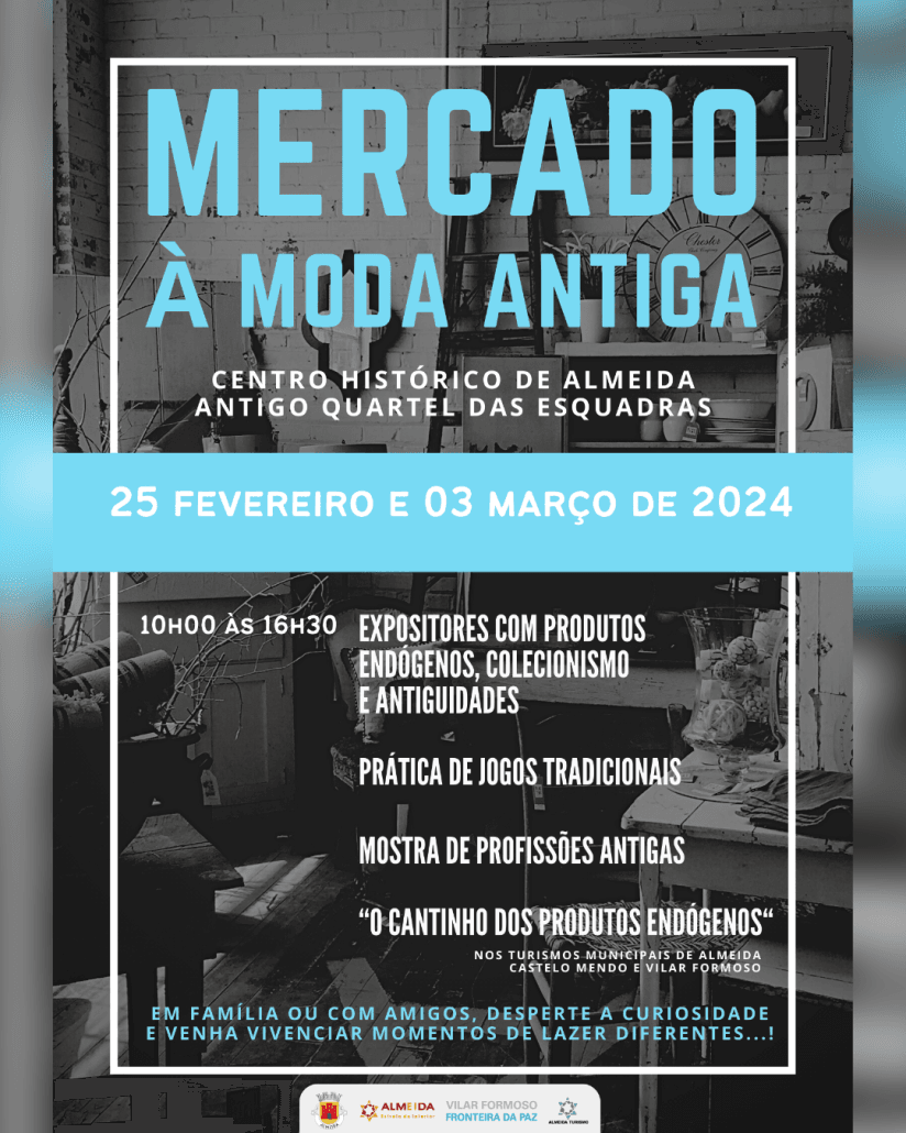 O Antigo Quartel das Esquadras será novamente palco do Mercado à Moda Antiga, que irá decorrer nos dias 25 de fevereiro e 03 de março de 2024, no Centro Histórico de Almeida.