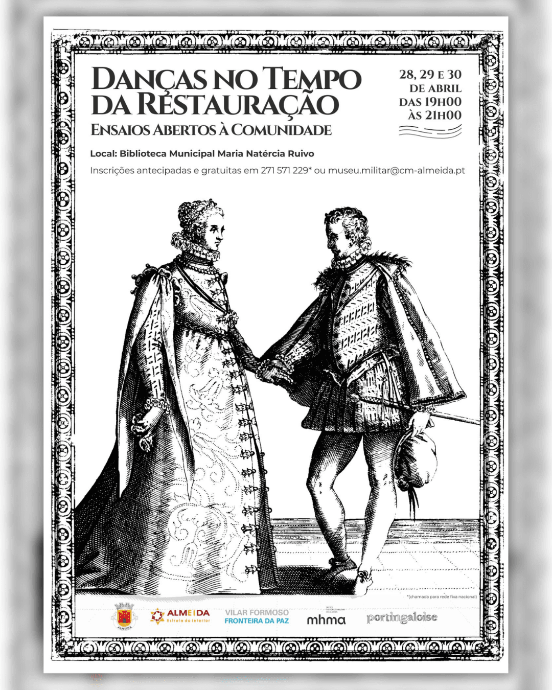 Com a aproximação do Dia Mundial da Dança, o Município de Almeida, através do Museu Histórico-Militar de Almeida, com a colaboração com a Biblioteca Municipal Maria Natércia Ruivo, promove, nos dias 28, 29 e 30 de abril, entre as 19h00 e as 21h00, uma nova edição da oficina “Danças no Tempo da Restauração”, dirigida a jovens e adultos, sob a orientação da Associação Cultural e Artística Portingaloise.