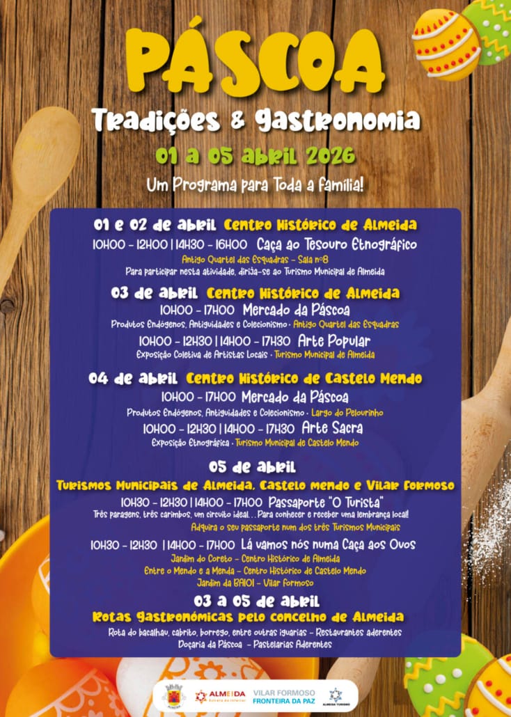 De 01 a 05 de abril de 2026, o concelho de Almeida convida-o a viver uma Páscoa divertida, que envolve criatividade e participação em várias atividades, em família. Entre no espírito da época com a Caça aos Ovos, explore os Mercados da Páscoa em Almeida e Castelo Mendo ou deixe-se envolver com as Exposições Etnográficas da Arte Sacra e do Mundo Rural.