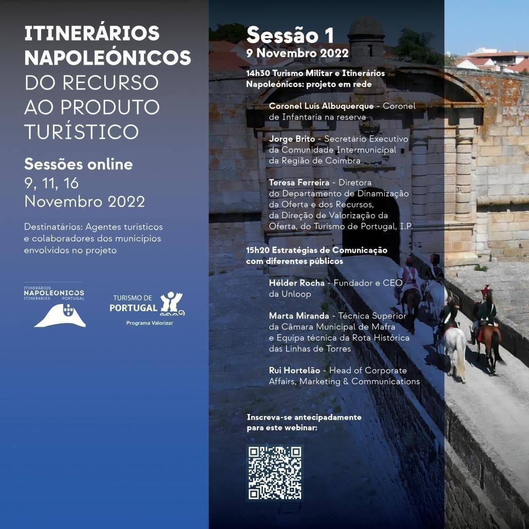 A Comunidade Intermunicipal da Região de Coimbra, os municípios de Almeida, Bombarral, Elvas, Lourinhã, Mealhada, Mortágua, Penacova e a Associação para o Desenvolvimento Turístico e Patrimonial das Linhas de Torres Vedras (municípios de Arruda dos Vinhos, Loures, Mafra, Sobral de Monte Agraço, Torres Vedras e Vila Franca de Xira) têm a honra de convidar V. Exa para as 3 sessões online de apresentação do projeto Itinerários Napoleónicos, do recurso ao produto turístico, integrado na Rede Temática das Invasões Francesas em Portugal, que decorrerão nos dias 9,11 e 16 de novembro, com início às 14h30m.