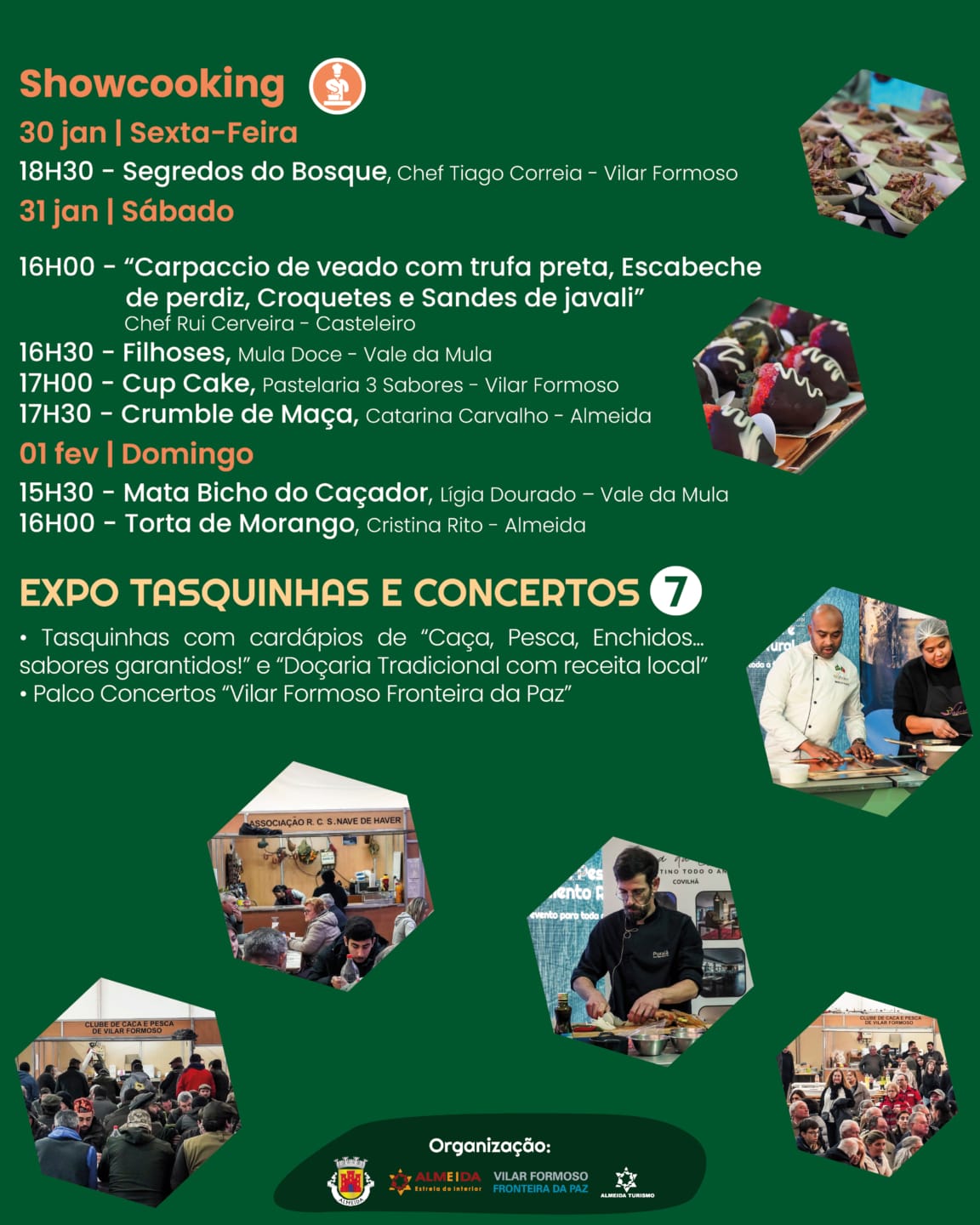 -Sábado,16h00: O Chef Rui Cerveira apresenta delícias de caça (Carpaccio de veado, Escabeche de perdiz, Croquetes e Sandes de javali), seguidas das apresentações de doçaria local: 16H30 – Filhoses da Mula Doce, 17H00 – Cup Cake da Pastelaria 3 Sabores e 17H30 – Crumble de Maça, com Catarina Carvalho.